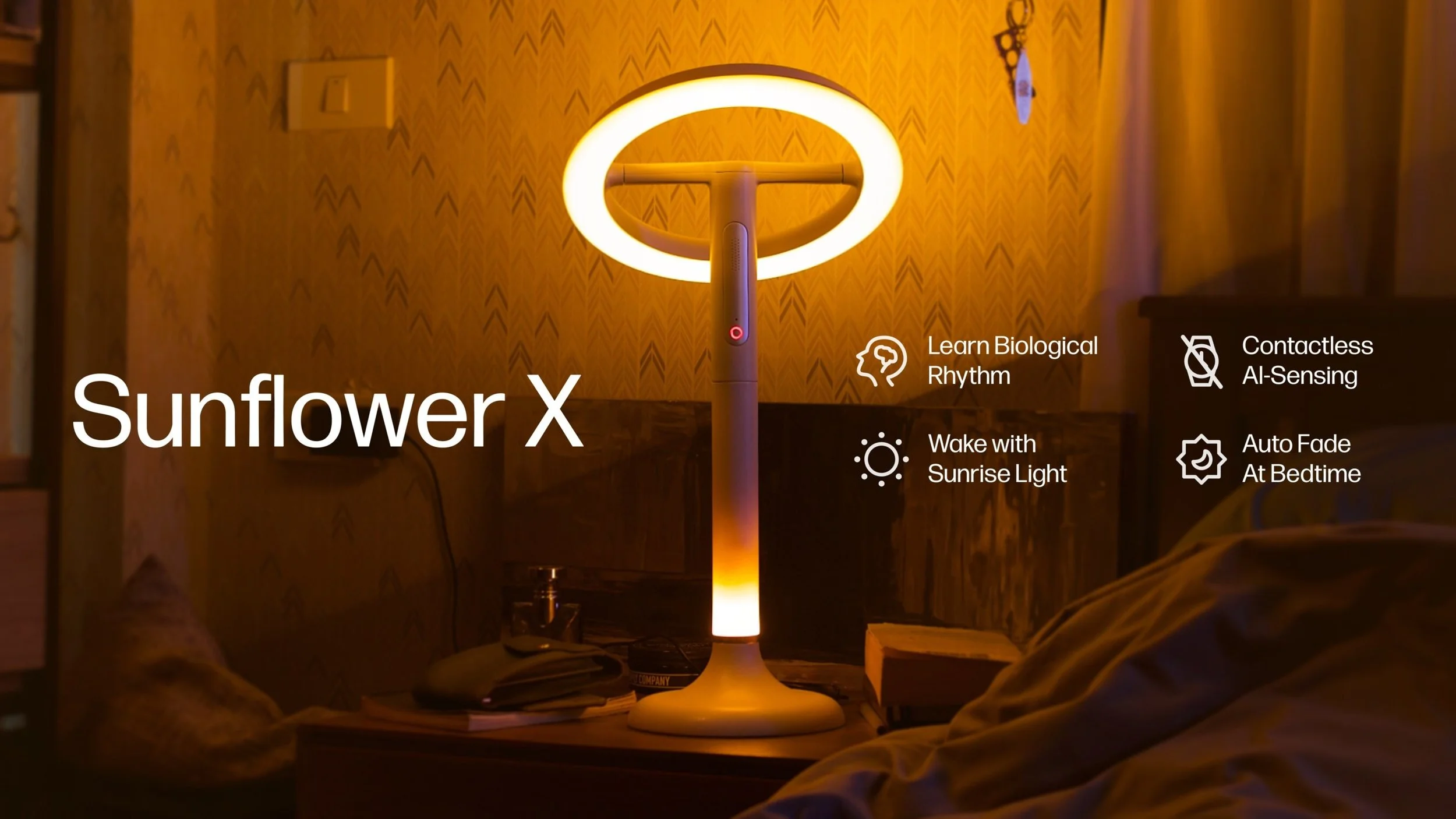 Sunflower X is a smart bedside lamp that starts waking users during the best wake-up window, auto-fades light and audio after they fall asleep, contactlessly monitors sleep and body status without using a camera, and adapts its self-optimizing personalized wake-up curve to everyone's natural body rhythm.